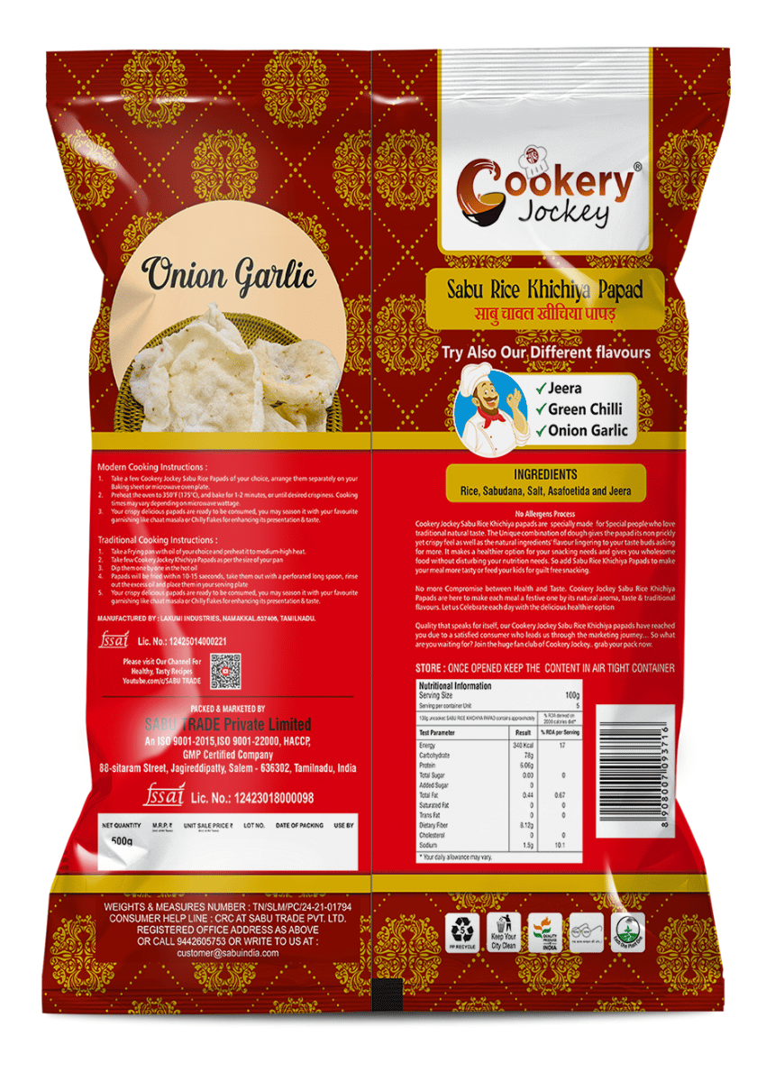 Cookery Jockey Sabu Rice Khichiya Onion Garlic papads are specially made for Special people who love Traditanal natural taste. The Unique combination of dough gives the papad its non prickly yet crispy feel as well as the natural ingredients flavour lingering to your taste buds asking for more. It makes a healthier option for your snacking needs and gives you wholesome food without disturbing your nutrition needs. So add Sabu Rice Khichiya Papads to make your meal more tasty or feed your kids for guilt free snacking. The unique combinational of Deep fry the Papadums for the crispiest results found in the Image, Yummy and Crunchy Papadums Ready to Fry.